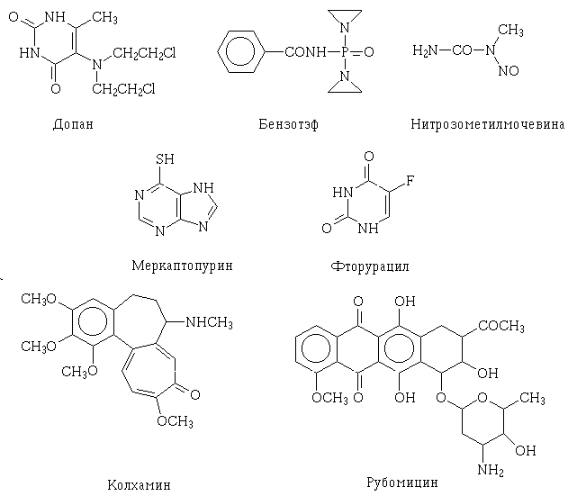 Противораковые препараты сильно различаются механизмами действия. В верхней строке - химические модификаторы белков и нуклеиновых кислот. В средней - антиметаболиты пуриновых оснований. Колхамин нарушает работу митотического аппарата делящихся клеток, а рубомицин - биосинтез нуклеиновых кислот.Главная беда здесь в том, что в организме больного достаточно часто делятся не только раковые клетки, но и многие другие, например, эпителиальные и стволовые ( а у доброй половины пораженных раком, между прочим, непрерывно образуются сперматозоиды). Все эти вполне нормальные клетки тоже поражаются цитостатиками, и потому химиотерапия рака становится прогулкой по узкой тропке, разделяющей две пропасти - смерть от болезни и смерть от лечения.