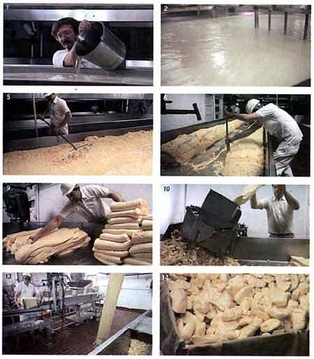 Производство сыра "Чеддер" на одном из заводов компании Great Lakes CHEESE of New York, Inc. в Адамсе. шт. Нью-Йорк. Вначале коровье молоко подготавливают для сыроварения: в него добавляют молочнокислые бактерии, необходимые для ферментации, и окрашивающие вещества. Затем в молоко вводят сычужный ферментный препарат, и оно свертывается, так что образуется сгусток (1). Примерно через 30 мин сгусток разрезают проволочными ножами, чтобы увеличить поверхность сырной массы (2). Полученные сырные зерна прогреваются (3) в течение примерно часа, что приводит к их сжатию и отделению сыворотки (4). Затем зерна сгребают, слегка прессуют и многократно переворачивают (5-9), - это так называемая чеддеризация, благодаря которой сыр обретает характерную консистенцию. Образующиеся куски измельчают (10), солят (11), заворачивают в ткань (12-14), прессуют в специальных формах - обручах (15) для удаления лишней сыворотки. Вынутые из формы сыры упаковывают в тару и выдерживают в течение 2 - 12 месяцев при температуре 2 - 10°С, постоянно отбирая пробы (16).