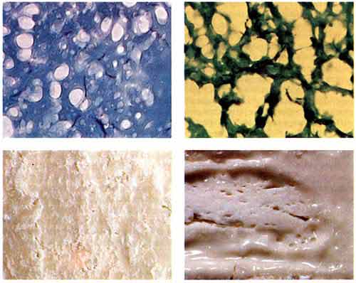 Структура сыров пармезан (спева) и камамбер (справа). Вверху - микрофотографии (увеличение х 2500). сделанные Р. Маре из Nestle Co., Швейцария. Внизу - фотография разрезанных кусков сыра. Пармезан относится к твердым сырам, а камамбер - к мягким.Если для созревания данного сорта сыра требуются специальные микроорганизмы, то их можно вводить в рассол. Они могут также быть добавлены в молоко на подготовительных стадиях или рассеяны по поверхности незрелого сыра.