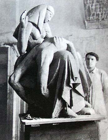 «Страшная это вещь - неэмоциональное искусство. В скульптуре - это комканье глины, в графике - извод бумаги, в живописи - марание холста. Я говорю о конечном результате работы художника: пока учится, ох, как много изведется красок, бумаги и холста! и на здоровье! чем больше, тем лучше. Но когда художник созрел, то начинается служение человечеству и великий запрет безразличию».«Пиета» вылеплена из глины в натуральную величину. Увы! Ей не суждена долгая жизнь. Мухина, не оставляя госпиталя, начинает работать в Камерном театре, и времени «присматривать» за скульптурой, следить, чтобы не рассохлась, не потрескалась глина, у нее не остается. Она просит одного из знакомых, и тот, не умея обращаться с глиняной моделью, губит ее, неумеренно заливая водой.«Переусердствовал», - горько усмехалась Вера Игнатьевна. Впрочем, горечь этого удара была смягчена для нее тем, что сразу же после окончания работы «Пиета» как бы отошла для нее на второй план. Мухина пылко увлеклась своим «театральным дебютом». С головой окунулась в неожиданное и незнакомое дело оформления спектакля.