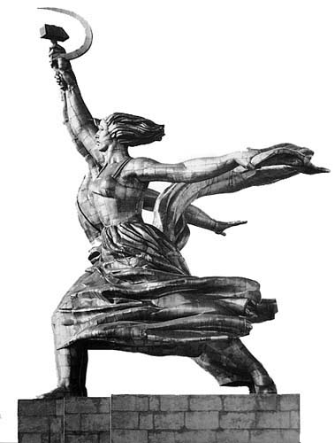Новое здание университета - огромное, многоэтажное, со шпилями, портиками, колоннами. К нему ведут зеленые партеры, широкие автострады. Пышность эта подавляла многих скульпторов, работавших над его оформлением одновременно с Мухиной. Но не ее. В ее героях нет никакой парадности, это скромные молодые люди. Единственное торжественное в них - это осанка, поза, поворот головы.