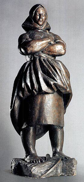 И конечно, даже неискушенный читатель назовет среди предшественниц парижской статуи мухинскую "Крестьянку" (1927). Это могучее олицетворение плодородной матери-земли. Критики по-разному оценивают эту скульптуру, пользовавшуюся неизменным успехом как в СССР, так и за границей, в частности на Венецианской Биенале 1934 года, где она была отмечена специальной наградой. Так, например, Н. Воркунова считает, что "стремление к монументализации образа привело Мухину в данном случае к внешнему подчеркиванию чисто материальной, физической силы, выявленной в утрированно массивных объемах, в общем огрублении и известном упрощении человеческого образа". Однако нам этот образ представляется вполне правдивым и отнюдь не огрубленным. Просто В.И. Мухина, не имея в это время возможности создавать действительно монументальные произведения, по испытывая внутреннюю тягу к этому, пошла в создании станкового произведения на явное применение приемов аллегории и монументализации. Отсюда и установка скульптуры "Крестьянка" на своего рода пьедестал из снопов, что было рекомендовано комиссией, просматривавшей эскиз статуи, а также явилось выражением общего стремления решить эту вещь как своеобразное обобщение и символ.