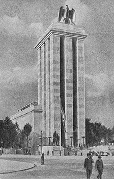 Кроме того, проектируя почти тотчас вслед за Парижским павильон для Всемирной нью-йоркской выставки 1939 года, Иофан явно учел опыт Парижа. Павильон для Нью-Йорка имеет гораздо более спокойные формы с подчеркнутыми вертикалями. Он также увенчан статуей, но пропорциональные отношения здесь взяты совершенно иные. Пилон-постамент по вертикали почти в 4 раза больше размера статуи. Кроме того, его функциональная роль незначительна, он, собственно, является украшением и эмблемой сооружения. Экспозиционные же залы расположены в кольцеобразном помещении, охватывающем этот центральный пилон со статуей. И здесь был действительно достигнут синтез скульптурной части с архитектурой при примате последней. Но к сожалению, на более тривиальном уровне, поскольку в данном случае архитектура и скульптура с образно-художественной стороны значительно уступают тому, что было сделано в Париже. Повидимому, причины этого лежали не только в творчестве Иофана, но явились в какой-то мере опосредованным выражением тех процессов в жизни страны, которые произошли в 1937-1938 годах.