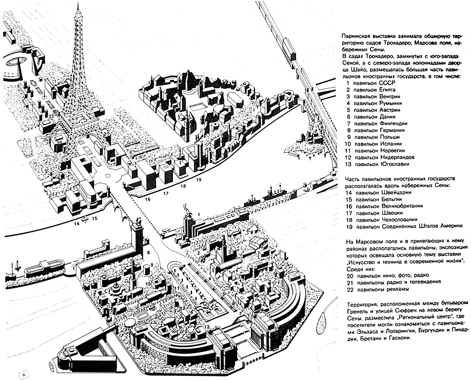 Главным французским сооружением на выставке являлся Дворец Шайо, возводимый на холме Трокадеро. Ниже и слева на берегу Сены, на набережной Пасси, был выделен узкий, вытянутый прямоугольный участок для павильона СССР, а напротив него, через площадь Варшавы, - примерно такой же прямоугольник для павильона Германии. Издали, с противоположного берега Сены, вся эта композиция с Дворцом Шайо в центре и несколько вверху и павильонами СССР и Германия по флангам воспринималась как своего рода планировочное отражение социально-политической ситуации в тогдашней Европе.