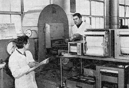 Оператор не присутствует при самом процессе спекания. Он сидит в соседней комнате и следит за приборами. Стрелка самописца чертит на экране кривую повышения температуры в зоне спекания. Малейшее отклонение от заданных параметров должно регулироваться и исправляться.