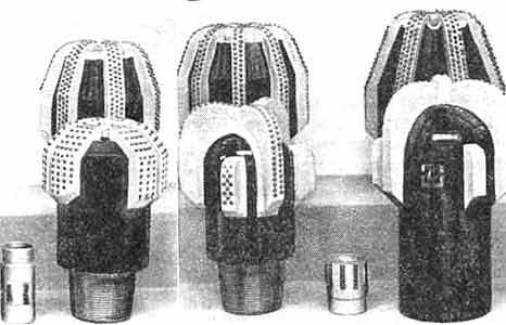 Однако в первой половине XX века человечество, как мы уже говорили, знало только природные алмазы. Стоили они очень дорого, да и добывали их не так уж много, чтобы сотнями укреплять на каждом буре. Наиболее распространенным буровым инструментом в 20-50-е годы нашего столетия было шарошечное долото с твердосплавными зубками. За один год в мире выпускалось порой до миллиона шарошечных твердосплавных долот. Бурить шарошечным долотом было нелегко. Твердосплавные зубки, вмонтированные в шарошки, быстро затуплялись, особенно при бурении твердых пород. Приходилось очень часто поднимать из скважины бурильные трубы, чтобы заменять пришедшие в негодность шарошки. И чем глубже в недра земли уходили шарошки, тем чаще надо было останавливать работу и поднимать бурильные трубы на поверхность.
