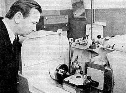В одно из своих посещений лаборатории, где работает Гончаренко, я застал его за шлифованием резьбы накатных роликов для изготовления винтов M1,7X0,35, которые миллионами потребляют приборная и часовая промышленность. Комплект таких твердосплавных роликов позволяет на специальном станке накатывать резьбу на миллионах винтов, тогда как обычные, изготовленные из лучей легированной стали ролики накатывают резьбу не более чем на 5 тысяч винтов. Но изготовление износостойких роликов было невозможно, пока не было создано простейшего устройства для обкатки острия алмазного круга.