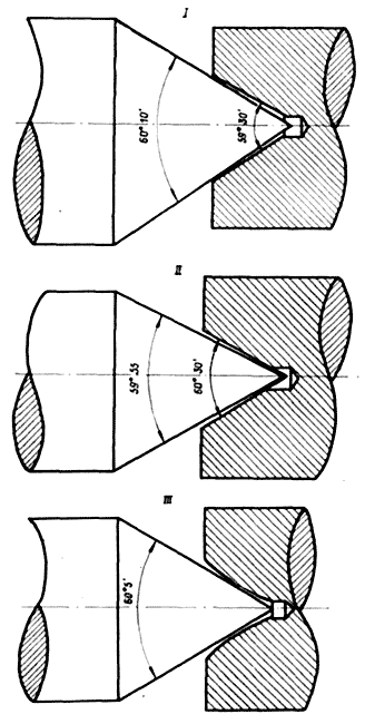 Именно с этим и столкнулся Гончаренко, когда делал на центровой оправке половинки правящего ролика. Профиль роликов 30 градусов имел биение в 0,03 миллиметра, а это совершенно недопустимо. Чайка и Гончаренко подумали и решили, что центровые отверстия вообще не надо делать с углом 60 градусов. Они сделали зенковки не с угловой, а с несколько криволинейной поверхностью, и теперь, какой бы ни был угол центров круглошлифовального или резьбо-шлифовального станка, на оправке или калибре при начале шлифования образовывалась узкая притертая полоска. Даже при изменении угла у центров на 1 градус центры всегда опирались на эту полоску. Биения не было ни на одну сотку. Именно такие зенковки и такие центровые отверстия предлагалось делать на всех калибрах-пробках и на других деталях, имеющих малый допуск на эксцентриситет.