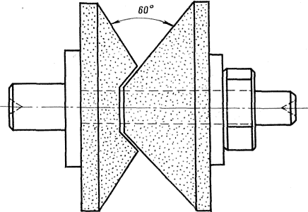 для накатывания алмазных многониточных резьбошлифовальных круговЧайка сказал: "Уж если алмазы у нас рукотворные, то такую проблему как-нибудь решим". Наука и рабочая сметка одолели и эту трудность. Гончаренко сделал для обкатки алмазного круга твердосплавный ролик из двух половинок в виде конусных шайб, сидящих на одной оправке. В таком случае без каких-либо сложностей и затруднений у ролика всегда получается внутри теоретическое острие, как у бритвы. Одна конусная шайба имеет односторонний угол 30 градусов и входит этим углом во внутренний конус 30 градусов второй шайбы, которая также имеет наружный конус 30 градусов, как у первой шайбы. Наружный конус наименьшим диаметром заканчивается на острие начала внутреннего конуса. Это острие не составляет труда получить при шлифовании обычным алмазным кругом, так как угол тупой (120 градусов) и твердый сплав на нем остается без изъянов, никогда не осыпается.
