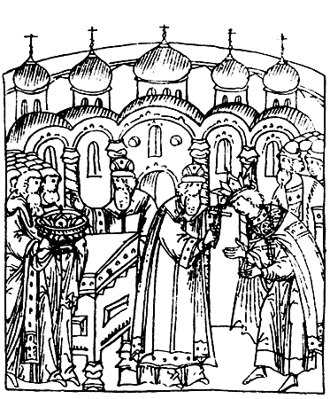 Почему Иван IV прародительским чином называл титул царя, которого на самом деле не носили его предки? Ведь все они были лишь великими князьями, только иногда, не столь в официальных документах, сколь в публицистике, их для пущей торжественности именовали царями. Причина состоит в том, что особое уважение к старине, традиции, «пошлине» характерно для средневековой идеологии. В наше время говорят, что новое - хорошо забытое старое, ибо у нас часто старое маскируется под новое: так велико наше уважение к прогрессу, к новаторству. Средневековый темп жизни, когда человек обычно оставлял мир почти таким же, каким застал при рождении, диктовал традиционность общественного сознания. Наша пословица не могла сложиться в те времена, когда новое обязательно маскировалось под старое, под восстановление нарушенного обычая. Основанием же была популярная легендарная повесть «Сказание о князьях Владимирских». В ней рассказывалось, что византийский император Константин Мономах (византийских императоров на Руси называли царями), родной дед киевского князя Владимира Всеволодича Мономаха, прислал внуку свой царский венец – «шапку Мономаха» и все права на царский титул. Нужды нет, что тот головной убор, который называли шапкой Мономаха, на самом деле - золотая тюбетейка среднеазиатской работы, опушенная соболем и увенчанная уже в Москве крестом, как полагают, подарок хана Узбека Ивану Калите.