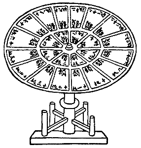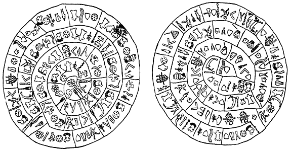 В 1908 г. итальянский археолог Луиджи Пернье, раскапывая царский дворец в г. Фесте, отыскал небольшой - диаметром 15,8-16,5 см и толщиной 1,6-2,1 см - диск, изготовленный из обожженной глины. С обеих сторон он был покрыт множеством размещенных по спирали рисуночков, сгруппированных и помещенных в прямоугольные ячейки. Всего таких ячеек 30 с одной стороны и 31 - с другой. В каждой ячейке по 2-7 знаков, общее количество их 241. Ученые сразу заметили, что рисуночки повторялись. Неповторяющихся знаков было всего 45 [12]. Не будем рассказывать о дешифровке надписи диска из Феста - это была трудная задача. Однако отметим, что уже первые исследователи установили: одни и те же рисуночки-знаки оттиснуты одним штампом. В распоряжении человека, изготовившего диск, было 45 предварительно выгравированных штампиков, которые он последовательно оттискивал на сырой глине.