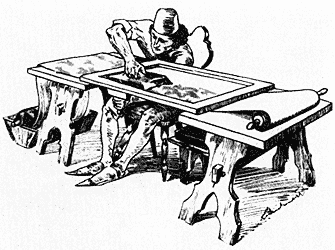 "Возьми подрамок вроде затянутой оконной рамы в два локтя длины и один локоть ширины, - писал Ченнини, - на который по всем правилам прибито полотно... Если же тебе нужно раскрасить ткань в количестве шести или двадцати локтей, то сверни ее, а конец помести на названный подрамок. Возьми доску из орехового, грушевого или другого очень твердого дерева величиною с кирпич или с обожженный камень; рисунки на этой дощечке должны быть нарисованы и вырезаны углубленно... На дощечках должны быть изображены все виды узора, который тебе требуется, листья или животные... У доски должна быть ручка, чтобы ее можно было поднимать... Когда захочешь работать, надень на левую руку перчатку, а раньше приготовь тонко стертой с водой черной краски из виноградных лоз".Поясним, что лучшей черной краской в средние века считали сажу, полученную при сжигании виноградной лозы и растертую с растительным маслом. Не исключено, что такая краска использовалась и первыми типографами."Затем хорошо высуши эту краску на солнце или на огне, - продолжал Ченнини, - и снова сотри ее; смешай ее с жидким лаком столько, чтобы хватило для работы; часть этой черной краски возьми ложечкой, размажь на ладони (по перчатке) и пройди ею, хорошо смазывая доску там, где она вырезана, так, чтобы не заполнить выемок. Клади доску ровно и последовательно на натянутую на подрамке ткань... Когда... краска хорошо впиталась в ткань или полотно, сними свою модель, намажь ее снова краской и вновь, с большой тщательностью, клади ее столько раз, пока не заполнишь всего куска (ткани)".Глава оканчивается такими словами: "Всякое искусство по своей природе изящно и приятно, но достигает его только тот, кто упорно к нему стремится... " [33].Описанный Ченнини процесс в основных чертах сохранился вплоть до XIX в., когда были изобретены тканепечатные машины. Набойка - это в полной мере полиграфический процесс с использованием форм высокой печати. Такой формой служит гравированная деревянная пластина. Способ получения оттисков с деревянных пластин был назван ксилографией (от греческого ксилон, что значит срубленное дерево, и графе - пишу, рисую).
