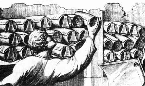Какую-то наборную технику использовали древние римляне. Об этом свидетельствует загадочная фраза в одном сочинении Марка Туллия Цицерона (106-43 до Р.X.). Опровергая доводы адептов случайного происхождения мира и видя во всем волю бессмертных богов, прославленный древнеримский оратор прибег к остроумной, но далеко не убедительной аналогии: