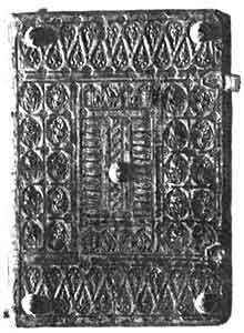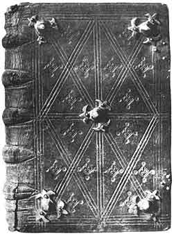 Переплет XII в. с тисненными украшениями По крайней мере в XIV в. на переплетах, кроме орнаментальных украшений, появляются и надписи, оттиснутые штампами. Многочисленные примеры приведены в работах Ганса Лубье, Павлины Хамановой и других историков [10].