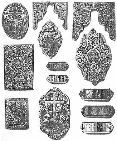 Книжный переплет возникает с появлением кодекса в I-II вв. после Р. X. (если не считать переплетами футляры древнейших свитков). Тогда же переплеты начали украшать. На коже, которой обтягивали деревянные доски, служившие переплетными крышками, вырезали различные орнаментальные узоры, а затем и фигурные изображения. Переплеты уже в VIII в. украшали с помощью так называемого слепого (бескрасочного) тиснения. Один из старейших примеров - кодекс "апостола Германии" св. Бонифация (680-754), созданный в основанном им Бенедиктинском монастыре в Фульде, с переплетом ирландской работы [9]. В возникшем позднее т.н. готическом переплете такая техника становится широко распространенной. Используют ее и в славянских странах. Кроме обычных плоских штампов, которые разогревали и прижимали к коже, в инструментарии переплетчика появляются различные их модификации, позволяющие увеличить, а точнее удлинить, размеры изображения. Среди них всевозможные качалки и так называемые дорожечники - закрепленные на ручке подвижные цилиндрики, покрытые орнаментальной резьбой. Здесь использован тот же принцип воспроизведения рельефных изображений, что и в цилиндрических печатках Двуречья, о которых шла речь выше.