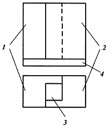 Принцип построения словолитной формы Какой была словолитная форма, применявшаяся Иоганном Гутенбергом, сказать трудно. Никаких сведений об этом не сохранилось. Можно лишь реконструировать принцип действия такой формы. В самом простом случае это были две Г-образные детали 1 и 2, составленные таким образом, что между ними возникала полость 3. Снизу полость закрывали матрицей 4 с прямым углубленным изображением шрифтового знака. Чтобы получить литеру, сверху в отверстие полости нужно было залить расплавленный металл.