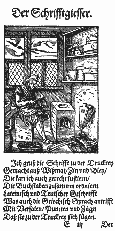 Древнейшее изображение словолитной формы находим на гравюре 1568 г. Иоста Аммана "Словолитец" из книги "Подлинное состояние всех состояний на земле". Это альбом, талантливые гравюры которого сопровождены неприхотливыми стихами Ганса Сакса. Под гравюрой, изображающей словолитца и озаглавленной "Der Schrifftgiesser", помещено стихотворение, составленное из попарно рифмованных строк. Мы предлагаем его вниманию читателей в нашем прозаическом переводе: