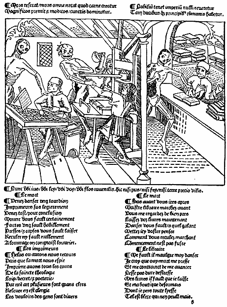 Гравюра "Танец смерти" из лионского издания 1499 г.Примерно такой инструментарий был и в типографии Иоганна Гутенберга. Быть может, он использовал верстатку, рассчитанную на набор сразу двух колонок текста (его Библии были двухколоночными изданиями).
