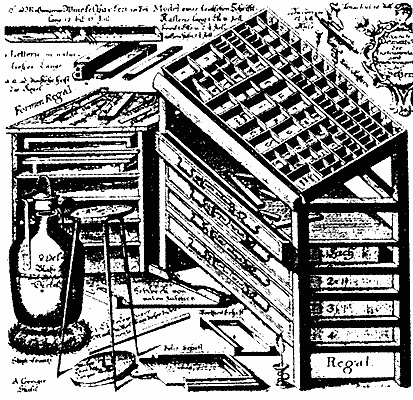 из книги X.Ф. Гесснера. 1740-1745 гг.Повторим, что время в феодальном обществе шло медленно. Технические решения, когда-то найденные, оставались неизменными на протяжении многих десятилетий. Поэтому у нас есть все основания предположить, что в типографии Иоганна Гутенберга использовался тот самый наборный инструментарий, который мы видим на гравюре 1499 г. и на рисунках из книг Моксона и Гесснера.