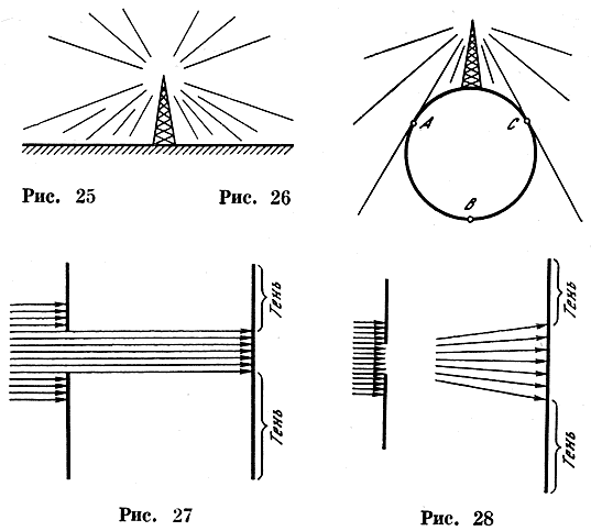 Почему же это происходит? Одной из возможных причин является дифракция радиоволн. Явление дифракции заключается в следующем. Возьмем параллельный пучок световых волн, и пусть этот пучок падает на непрозрачный экран с отверстием (рис. 27). Позади этого экрана поместим другой плоский экран. Тогда мы можем ожидать, что на втором экране будет светлое пятно, форма которого точно воспроизводит форму отверстия, а во всех остальных точках экрана будет темнота - они попадут в область тени.