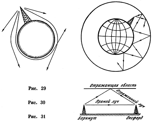 Хевисайд предложил другой механизм (рис. 30). Те лучи, которые уходят от Земли, падают на отражающий слой, расположенный на большой высоте, и попадают обратно на Землю. Они могут снова отразиться от Земли и снова попасть на отражающий слой, а затем снова вернуться на Землю. Таким образом, если действительно, как предположил Хевисайд, над Землей существует слой, отражающий радиоволны, становится возможной радиосвязь между двумя любыми точками земной поверхности.