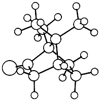 Рис. 15.5. Шаростержневая модель молекулы камфоры. Наиболее простое объяснение такой формы записи заключается в том, что химическое представление есть особый вид стенографии. Точно так же, как мы заменяем длинное название организации "Организация объединенных наций по вопросам образования, науки и культуры" на короткое ЮНЕСКО (UNESCO, United Nations Educational, Scientific and Cultural Organization), так и химик устает выписывать всеми (другими химиками) подразумеваемые атомы углерода и водорода и просто рисует так называемый углеродный скелет. Каждая вершина в этом структурном представлении - это атом углерода. Поскольку обычно валентность (число связей) углерода равна четырем, химик и его собеседники просто "пользуются кодом", в соответствии с которым все они знают, сколько атомов водорода связано с каждым атомом углерода. Многоугольник на рис. 15.2 является стенографической записью структуры, приведенной на рис. 15.3.