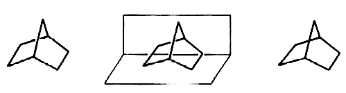 Рис. 16.4. Норборнан. Объемные молекулярные модели уже тогда были доступны, их легко можно было построить, однако, как мне кажется, в мозгу обычного химика 20-х годов образ норборнана соответствовал только левому, но никак не правому изображению. Это было обусловлено тем, что в журналах и учебниках можно было увидеть только плоскую структуру. Поразительно, даже этот столь нереалистический двумерный молекулярный образ мог все-таки часто вдохновлять химиков на творчество (например, на синтез производных норборнана).