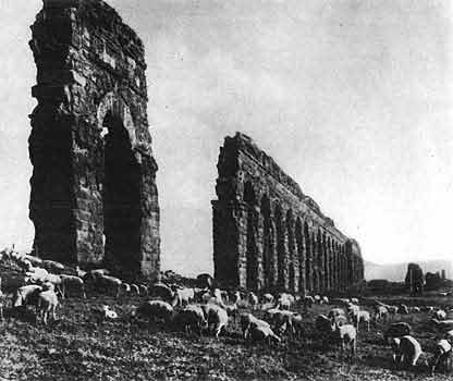 См. подробнее.Так возникло неповторимое явление архитектуры и строительного искусства, техники и культуры, в таком виде и в таких масштабах не встречавшееся никогда и нигде, - знаменитые римские акведуки. Благодаря высящимся до сих пор величественным их развалинам и полностью сохранившимся целым участкам они легко восстанавливаются перед умственным взором - то уходящие под землю, то взлетающие высоко над окрестностями, вьющиеся в обход гор или тоннелями пробивающиеся сквозь них.