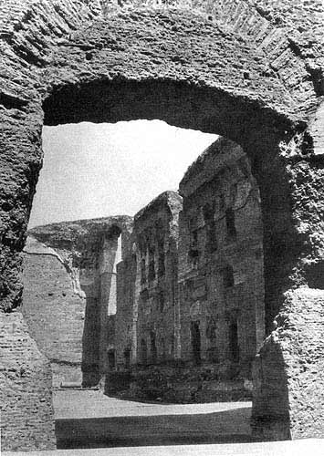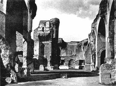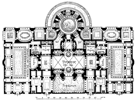 * Cм.:Fietz W.Op.cit.,S.86; Сергеенко М. Е. Жизнь древнего Рима, с. 145.В основе терм лежала все та же схема: аподитерий, тепидарий и дальше в различных группировках - кальдарий, фригидарий, бассейн для плавания, палестра; во многих случаях некоторые из этих помещений дублировались. Первоначально центром композиции была палестра - большой двор для занятий спортом, на который выходили остальные, расположенные по периметру помещения. Так выглядели, например, Стабиевы бани в Помпеях. Уже в термах Тита, однако, намечается тенденция, вскоре полностью восторжествовавшая, - сводить все помещения для мытья в единый комплекс и располагать его в центре огромного двора, обведенного портиками и экседрами. В наиболее чистом виде эта схема представлена термами Каракаллы и Диоклетиана. Помещения, располагавшиеся вокруг двора, были как бы царством духовной культуры - здесь прогуливались, читали, беседовали: собственно термы были царством культуры физической и телесной гигиены.