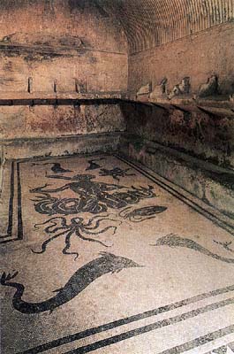 *** В западных провинциях они часто сооружались в местах, где до римлян отправлялся местный культ ручьев и текущей воды, так что их комфортный смысл был неотделим от сакрального. Таков, например, роскошный нимфей в Ниме, окруженный храмами, с театром, алтарем, искусственным островом. См.: Harmand L. L'Occident Remain. Paris, 1960, p. 331.* Филострат. Жизнеописание Аполлония Тианского, VIII, 11.![]()