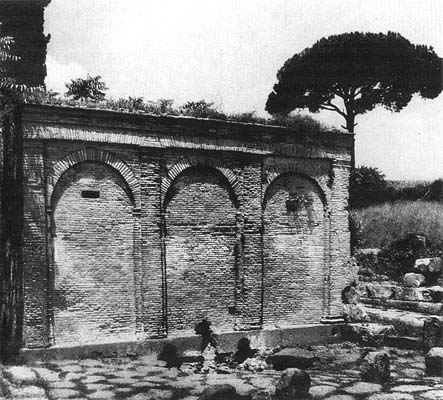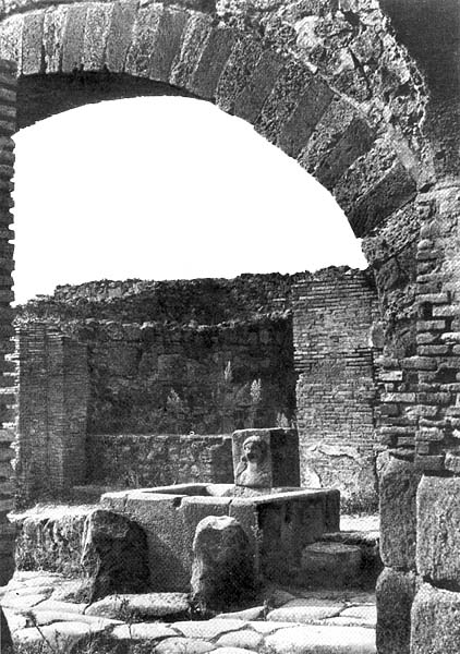 * Цицерон. Письма Аттику, 1,10,3.Вместо опор, вмурованных в углы puteal'a, рядом с ним теперь нередко ставятся колонны, придававшие колодцу вместе с крышей облик миниатюрного архитектурного сооружения. Ограда уличного водоразборного бассейна представляла собой примитивный каменный ящик. Но труба, по которой в него поступала вода из подземной линии городского водопровода, была скрыта в поставленной на борт ящика каменной стеле, непременно украшенной накладным рельефом - зайцем, головой ослика, каким-либо иным художественным изображением.