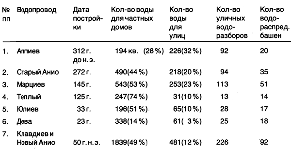 **** См.: Сергеенко М. Е. Жизнь древнего Рима. Очерки быта. М-Л. "Наука", 1964, с. 58; Fietz W., Op. cit. S.58. Плиний Старший (Естественная история, 3, 54) полагал, что водопроводы приносят в Рим столько же воды, сколько получает Тибр от всех сорока своих притоков.