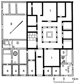 1 - жилые комнаты; 2 - маслодавильная мастерская; 3 - пекарня; 4 - лавки (таберны)Для того чтобы представить себе реальное соотношение домуса и многоквартирного дома, необходимо вспомнить, что основной смысл слова "инсула" - это застроенный участок, ограниченный со всех сторон улицами, независимо от того, застроен он особняками или доходными домами *. Именно так этот термин употребляется систематически в своде римского права - "Дигестах". Перенесение его на многоквартирный и многоэтажный дом было возможно потому, что между тем и другим не видели принципиальной разницы.