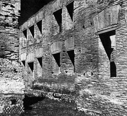 Многоквартирные инсулы, какими они стали после римской архитектурной революцииВсе это - вещи, широко известные, и к ним можно было бы не возвращаться, если бы не два обстоятельства, одно из которых освещается в литературе редко, а другое - никогда, и без которых завершить рассмотрение римской тесноты именно как исторического явления вряд ли возможно. Первое из них состоит в том, что технические, строительные и государственно-политические предпосылки римской архитектурной революции существовали очень задолго до нее. Масштабные сооружения флавианской (69-96 гг.) и последующей эпох были невозможны без строительного раствора, который римляне называли "opus caementicium", а мы, за неимением лучшего слова, - "римским бетоном". Но этот "бетон" применялся в Риме с III в. до н.э. и довольно широко, возможности его были известны, однако в массовом масштабе не использовались вплоть до общей перестройки материально-пространственной среды во второй половине I в. н.э.