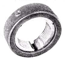 Когда я приступил к операции доводки, то после третьего кольца у меня заболели кисть и локоть правой руки, которой приходится держать кольцо. Доводка (т.е. съем на плоскостях резьбы припуска, оставленного для термообработки) обычного цилиндрического резьбового кольца происходит при движении кольца по всей длине притира. Притир внутри имеет конусное отверстие и сидит на гладкой конусной оправке. Притир имеет один продольный разрез, благодаря чему немного разжимается, т.е. в процессе работы может увеличиваться по диаметру, а следовательно, внутри резьбы доводимого кольца он двигается всегда с напряжением. Намазанный абразивной пастой, притир довольно быстро снимает припуск на резьбе кольца и придает ей зеркальный блеск.