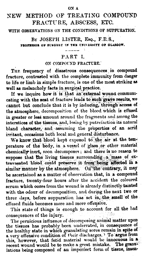 Из всех работ Пастера наибольшее влияние оказали на Листера те, в которых доказывалось, что брожение и гниение вызывается живыми существами, находящимися в воздушной пыли, и эта пыль может быть уничтожена при нагревании или фильтрации через вату или же задержана в изогнутых и вытянутых трубках бутылей. Не менее важным для Листера было указание Пастера на то, что жидкости человеческого тела, кровь и моча, свободны от микроорганизмов, и если эти жидкости тщательно сохранять в стерилизованных сосудах, то они неопределенно долгое время не подвергаются гниению. Таким образом, к 1865 г. Листер был уже в сущности вполне подготовлен к открытию антисептики.