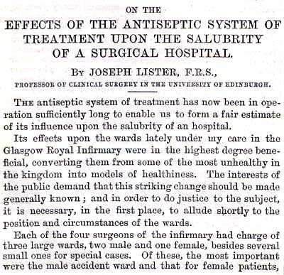 Благодаря новому методу лечения совершенно преобразились палаты Глазговского госпиталя. Раньше там свирепствовали всевозможные госпитальные болезни, а со времени введения антисептического метода в течение девяти месяцев не было ни одного случая госпитальной гангрены, пиэмии или рожи.
