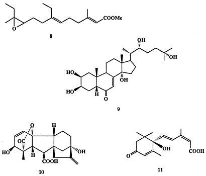 Другой терпеноид, абсцизин (11) [10], также выделенный из большого числа растений, играет роль антагониста гиббереллина. Действительно, было обнаружено, что в присутствии 11 подавляется рост побегов и инициируется образование “спящих” почек. Таким образом, переход от фазы активного роста в условиях длинного дня к фазе “сна” в условиях короткого дня контролируется балансом содержания в клетках соединений 10 и 11.