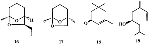 Половые аттрактанты многих других бабочек и мух тоже, как оказалось, имеют довольно простую структуру. Это, как правило, ациклические спирты с длинной неразветвленной цепью. Другие насекомые продуцируют в качестве половых феромонов соединения более сложной структуры, некоторые из которых (13-15) показаны на схеме 1.4 [12].