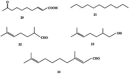 С помощью других сигналов, феромонов агрегации, “работники” сообщают о необходимости включиться в строительство в определенном месте. Задачей некоторых “солдат” является разведка новых источников пищи и обнаружение целей для “грабежа”. Естественно, что выполнение этой задачи требует использования феромонов, маркеров следа, причем эти сигналы должны быть достаточно специфичны, чтобы сообщения были понятны лишь членам данного семейства. Как правило, довольно простые по структуре вещества и их смеси используются муравьями в качестве химических сигналов. Так, например, в роли феромонов тревоги ряд видов муравьев использует набор веществ типа 20-24 (схема 1.6) в варьируемых соотношениях [14].