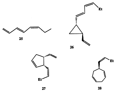 Интересно, что первые догадки о наличии таких химических сигналов высказывались наблюдательными натуралистами еще в середине XIX в. Так, в 1858 г. было предположено, что в цикле полового размножения морской водоросли Fucus serratus мужские половые клетки (андрогаметы) сближаются с женскими половыми клетками (гиногаметами) благодаря наличию в среде химических сигналов (хемотаксис) [15а]. Прошло более 100 лет, прежде чем удалось доказать справедливость предположения о роли продуцируемых и испускаемых в среду химических веществ как важнейших медиаторов в половом размножении. Оказалось, что для этой водоросли таким медиатором является триеновый углеводород фукозосерратен, C8H12 (25, схема 1.7), который продуцируется женскими половыми клетками и при попадании в водную среду служит половым аттрактантом для андрогамет. Подобный механизм широко используется и другими видами низших растений. Структуры 26-28 [15a, b] наглядно иллюстрируют, насколько разнообразные по строению углеводороды могут продуцироваться разными организмами для выполнения одной и той же функции.
