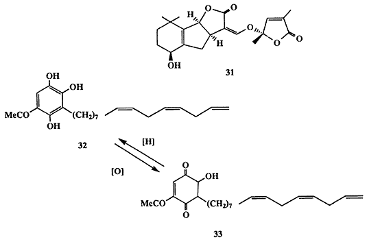 Одним из таких стимуляторов роста оказался терпеноид стригол (31, схема 1.9) [18а]. Естественно было предположить, что предпосевная обработка полей этим соединением будет вызывать прорастание семян сорняка и тем самым откроет возможность радикального решения проблемы борьбы с ним. Неудивительно поэтому, что многочисленные исследования были направлены на разработку удобного метода синтеза соединения 31 и его более простых аналогов [18b]. Впоследствии было обнаружен еще один активный стимулятор прорастания семян растения-паразита, также вырабатываемый растущими семенами злаков рода Sorghum, а именно замещенный гидрохинон 32 [18с]. Подобно другим гидрохинонам вещество 32 способно легко претерпевать окисление, давая хинон 33, и этот процесс легко протекает в почве. Хинон 33 не является стимулятором прорастания семян сорняка, и поэтому прорастание последних может произойти лишь в том случае, если семя растения-паразита находится на достаточно близком расстоянии к растущему корешку растения-хозяина, поскольку в противном случае стимулятор 32 успеет полностью превратиться в неактивный 33 в ходе диффузии через почву.