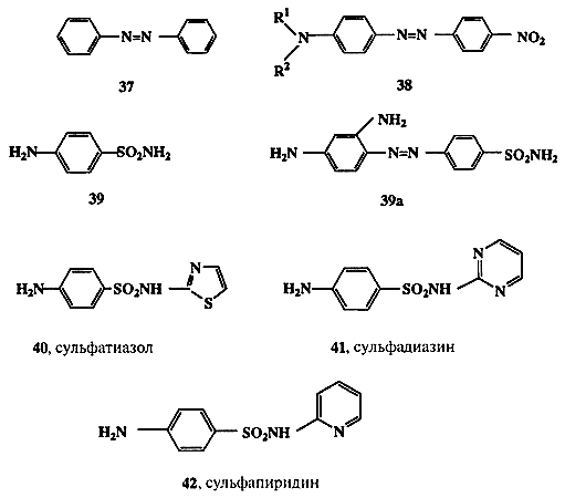 Вероятно, исторически первой областью органической химии, которая быстро и уверенно пошла по пути целенаправленного создания веществ с заранее заданными свойствами, была химия органических красителей. Здесь очень рано были сформулированы эмпирические правила (впоследствии превратившиеся в строгую теорию), связывающие структуру молекул с цветом вещества. В основе этих представлений лежит понятие о хромофоре — группировке атомов, ответственной за характерное для вещества поглощение света определенной длины волны. Одним из распространенных хромофоров синтетических красителей является диарилазогруппа, присутствующая, например, в молекуле азобензола (37, схема 1.12).