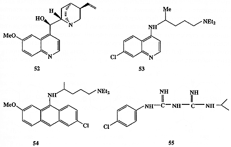 В дальнейшем предпринимались более осмысленные попытки полного синтеза хинина, увенчавшиеся успехом лишь в 1948 г. Параллельно этим работам также проводились поиски более дешевых средств против малярии. Были получены и испытаны тысячи возможных кандидатов на эту роль, иногда имеющих более чем отдаленное сходство с хинином. Некоторые из них, такие, как хлорохин (53), мепакрин (54) или прогуанил (55) (схема 1.14), нашли широкое применение в медицине как эффективные заменители хинина [25а].