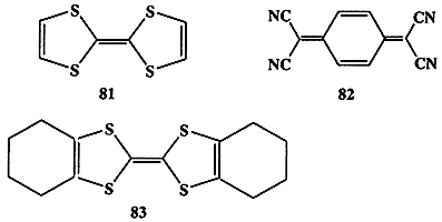 * Дальнейшее развитие работ в области допированных полиацетиленов оказалось чрезвычайно успешным, свидетельством чего может служить присуждение Нобелевской премии по химии за 2000 г. А. Хигеру, А. Мак-Диармиду и X. Сиракаве за “Открытие и развитие области электропроводящих полимеров” (подробнее об этом можно прочесть в статье: Кобрянский В. М., Природа, № 1, с. 7, 2001).** Уместно заметить, что полианилин был получен еще в 1862 г., но до недавнего времени никто и не подозревал о его довольно высокой электропроводности (200 См/см).В исследованиях несколько иного плана было обнаружено еще более интересное физическое свойство органических соединений, а именно способность некоторых органических веществ служить сверхпроводниками. Так, например, комплексы с переносом заряда тетратиафульвалена (81) и тетрацианохинодиметана (82) состава 1:1 (схема 1.24) способны не только проявлять свойства металлических проводников при комнатной температуре, но и становятся сперхпроводниками при низких температурах. Синтезированы и изучены многочисленные соединения этого и сходных типов. Среди них особенно интересными оказались комплексы с переносом заряда, полученные из бис(этилендитио)тетратиафульвалена и неорганических анионов. Некоторые из этих комплексов обнаруживали сверхпроводящие свойства при температуре 10, 4 К.