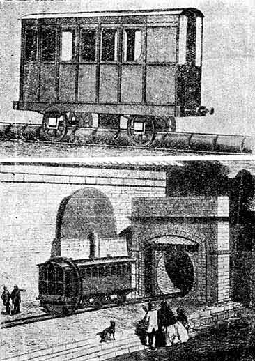 "Три экипажа находились на станции Кингстоун. К первому был прикреплен клапан, движущийся внутри трубы, на нем же имелся механизм для изменения скорости поезда и для остановки по прибытии в Далькей. Такой же механизм был устроен на втором экипаже, где помещалось много рабочих. Третий экипаж предназначался для директоров и их друзей - в общем более ста человек. Всем было интересно узнать результаты этого первого путешествия.Сообщение об успехе атмосферной дороги произвело сенсацию. Всячески превозносились достоинства нового способа передвижения - отсутствие дыма и копоти, плавность движения, устранение опасности взрыва котла и т.д. Слабых сторон нового изобретения или не желали видеть, или с неуместной снисходительностью объясняли их его детским возрастом. Пророчили повсеместный переход к новой системе. Дни паровоза, казалось многим, уже сочтены; не успев одержать еще полиой победы, он вынужден будет сойти со сцены. Подобного мнения придерживались такие выдающиеся инженеры, как Брюнель, Джон Уолькер и Чарьз Виньоль. Немедленно возникает компания, которая берет на себя постройку атмосферной рельсовой дороги между Лондоном и его предместьем Кройдоном. Во Франции инженеру Малле поручается постройка, в виде опыта, такой же дороги между Нантером и Сен-Жерменом, которая была окончена в 1847 году и действовала до 1859 года.Когда все было готово, в шесть часов вечера паровая машина в Далькее привела в действие пневматический насос. Он работал так хорошо, что через полминуты в трубе создалось необходимое разрежение.