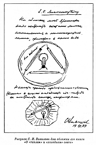 Глубокий интерес С. И. Вавилова к научной популяризации угадывался в каждой детали. Будущая обложка каждой популярной книги рассматривалась им самым тщательным образом. Для книги "О „теплом" и „холодном" свете" он сам дает рисунок и пишет в издательство: "...На обложке моей брошюры надо изобразить сочетание лампы накаливания и люминесцентной лампы примерно в таком виде... [рисунок]. Навести красоту предоставляю художникам. (Можно, в случае надобности, где-нибудь изобразить Солнце, например так... [рисунок])".