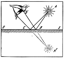 Первоначальное направление лучей, вышедших из глаз, "сигнализируется", по предположению древних, каким-то способом в мозг, и кажется, что встреча лучей произошла не после отражения, а в мнимой точке А', где пересекаются продолжения лучей, первоначально вышедших из глаза. Преимущество такого толкования заключается в том, что вовсе не требуется знание того, что происходит со светом внутри глаза. Достаточно лишь предположить, как это отмечено, что через глаз некоторым способом сигнализируется первоначальное направление зрительных лучей. Мнимое изображение создается в мозгу.