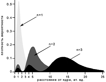 где a0 - радиус Бора (0.529 Е). В отличие от энергии, которая определяется только числом n, величина <r> зависит и от орбитального квантового числа I. Как видно из формулы, наиболее “раздут” атом в сферически симметричном состоянии (когда I = 0): в нем электрон в среднем более всего удален от ядра. Какова же структура электронного облака, или точнее - какова вероятность обнаружить электрон на данном расстоянии r от ядра? На рис.1 показана радиальная зависимость этой величины для первых трех (n = 1, 2, 3) S-состояний атома водорода (сферически симметричных). Видно, что характерный размер атома действительно быстро растет; электронное облако как бы выталкивается к периферии по мере его возбуждения. При данном n и I=0 электрон в среднем находится на расстоянии 3n2a0/2 от ядра, проводя основное время в слое толщиной na0.