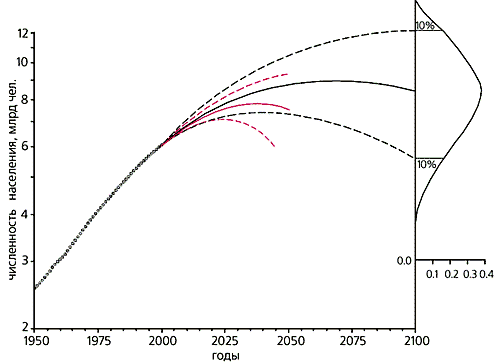 Год назад была высказана идея о возможном спаде мирового народонаселения начиная с середины текущего века, основанная на экстраполяции предыдущей динамики роста [2]. Она получила развитие в работе У.Лутца из Международного института анализа прикладных систем (Лаксенбург, Австрия), У.Сандерсона из Университета штата Нью-Йорк и С.Шербова из Гронингенского университета [3]. Ими рассчитаны возможные сценарии динамики мирового народонаселения в текущем веке и оценены их вероятности. Оказалось, что максимум мирового народонаселения, возможно, будет достигнут примерно в 70-х годах текущего века, а затем численность человечества начнет убывать. По моему мнению, этот момент все же наступит раньше, еще в первой его половине.